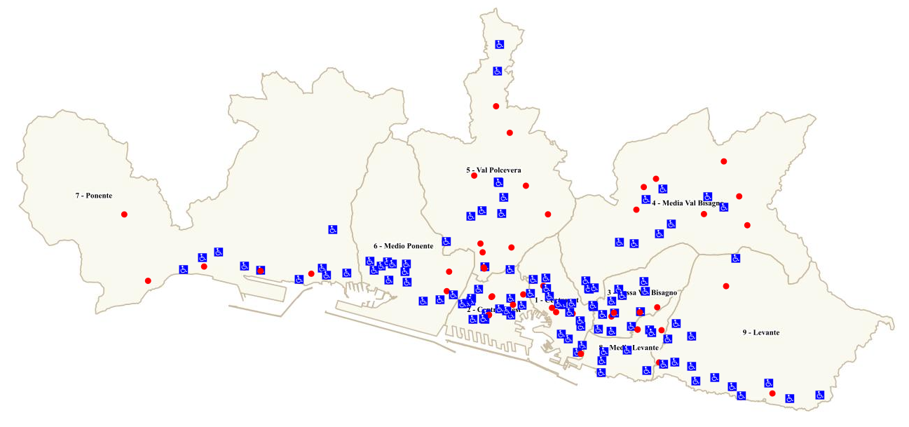 Elementi emergenti, con indicazione del grado di accessibilità, individuati dal piano di eliminazione delle barriere architettoniche P.E.B.A. Il Comune di Genova, in attuazione della legge N 41 del 28/02/1986, con delibera (DGC) n.143 del 14/07/2016 ha dato inizio all’iter per la redazione del Piano di Eliminazione delle Barriere Architettoniche (P.E.B.A.), che si è concluso con la approvazione in Giunta Comunale (DGC) n.23 del 11/02/2021. Il P.E.B.A. di Genova analizza dal punto di vista dell’accessibilità motoria e sensoriale il territorio comunale dividendolo in 94 Ambiti, ossia porzioni di territorio dove maggiormente si concentrano le funzioni pubbliche di rilievo e di interesse per il cittadino, restituendo una mappa con 4 colori a seconda del grado di presenza o assenza di barriere architettoniche.