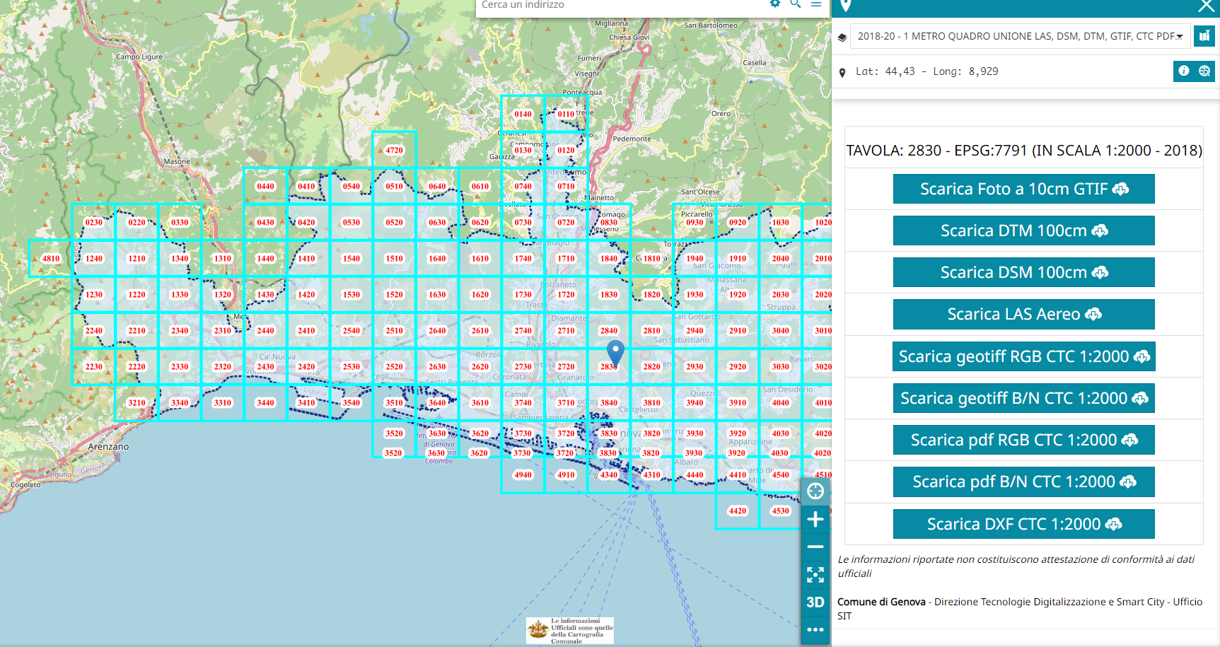 Mappa per il download di dati derivanti da rilievi: DTM, DSM, nuvole di punti, tavole di Carta Tecnica Comunale.