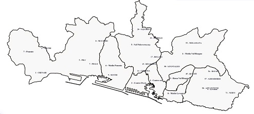Suddivisione amministrativa regolamentata dal "regolamento per il decentramento e la partecipazione municipale" del Consiglio Comunale 06/02/2007. Il livello rappresenta i limiti dei Municipi aggiornati alla data della delibera del Consiglio Comunale n.40/2020.