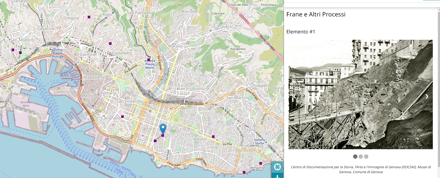 Livello costitutivo del progetto MIAGE relativo ai fenomeni franosi occorsi tra il XIX e il XX secolo. Esso è costituito da punti rappresentativi di immagini e fotografie provenienti dal DocSAI e Mu.MA (archivio fotografico Leoni).