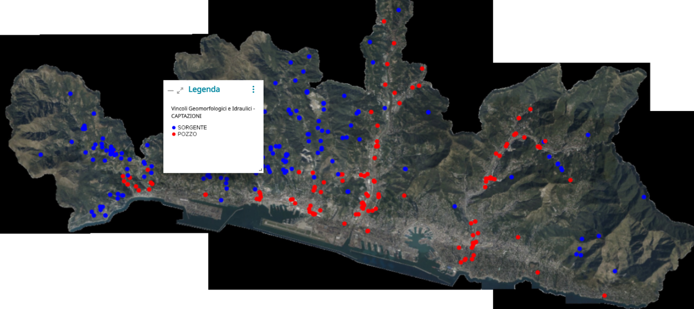 Pozzi e sorgenti (ad uso umano e non) facenti parte della carta idrogeologica del PUC e, limitatamente agli elementi ad uso umano, della carta dei vincoli geomorfologici e idraulici come aree soggette a specifiche limitazioni dell’attività edilizia.
